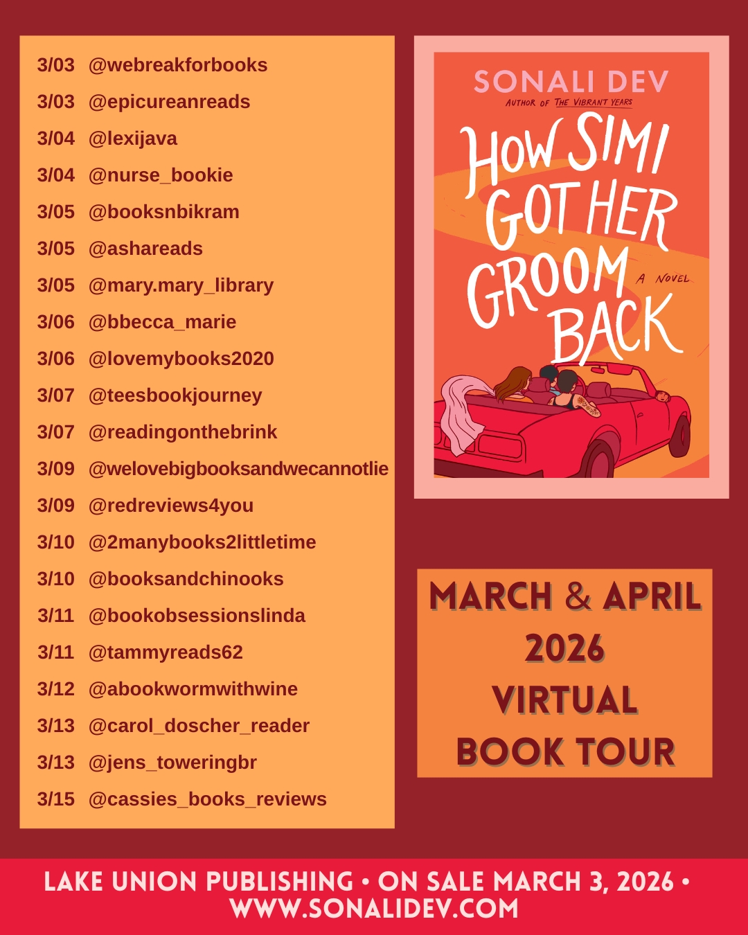 Throughout March and early April we will celebrate the release of HOW SIMI GOT HER GROOM BACK with this special virtual book tour, and we hope you will follow along to learn more about this wonderfully multifaceted, emotionally compelling novel: